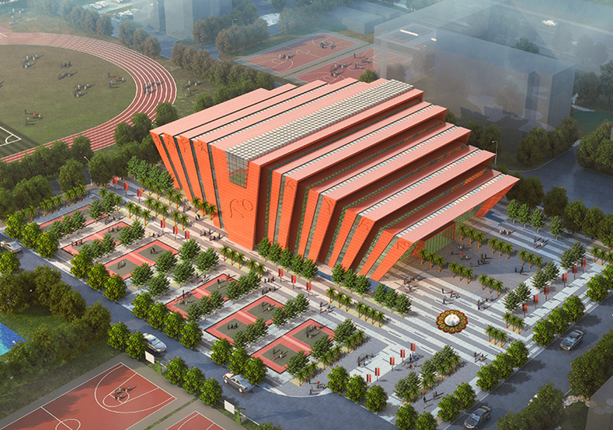 原學(xué)校顏色以灰白色為主要色調(diào),中學(xué)是一個年輕人集聚的場所是一群有朝氣,活潑的祖國未來的花朵。紅色代表著熱量、活力與意志力。因此體育館設(shè)計采用紅色作為主要色調(diào)。符合體育館的建筑性格。點綴整個校園,點燃學(xué)生的激情。